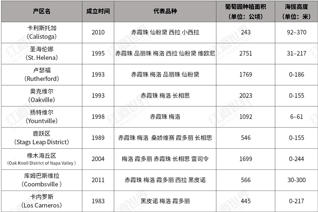 納帕谷坐落在圣帕布魯灣的北側以及舊金山灣(San Francisco Bay)地區的東北角,其東側是瓦卡山(Vaca),跨過這座山便可到達中央山谷(Central Valley)的北部,西側是梅亞卡瑪斯山(Mayacamas),也是納帕谷與索諾瑪縣(Sonoma County)的分界線。納帕谷南北長約50公里,東西跨度僅有幾公里,雖然面積不大,但這里是美國第一個農業保護區(Agricultural Preserve),也是加利福尼亞州的第一個法定種植區(American Viticultural Area,簡稱AVA)。根據不同的土壤、氣候和地形,產區內又細分為十六個法定種植區。