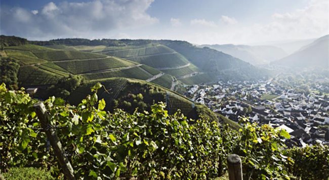 阿爾產(chǎn)區(qū)在德國的眾多產(chǎn)區(qū)中位置比較靠北,面積較小。該產(chǎn)區(qū)的葡萄園分布在阿爾河(Ahr River)沿岸,地勢比較陡峭。黑皮諾(Pinot Noir)是阿爾產(chǎn)區(qū)種植面積最廣的葡萄品種,在當(dāng)?shù)乇环Q為“Spatburgunder”。
