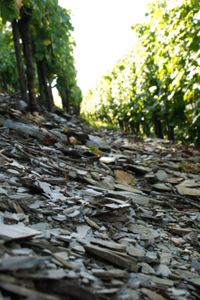 德國摩澤爾產(chǎn)區(qū)以出產(chǎn)優(yōu)質(zhì)的雷司令(Riesling)葡萄酒見長,其葡萄園里的土壤大多為藍色板巖和紅色板巖。這兩種土壤都較為貧瘠,擁有良好的排水性,在潮濕的生長季能防止葡萄根系因積水而腐爛。同時,它們的儲熱性也十分優(yōu)秀,即使是在涼爽的年份,也能幫助葡萄藤順利成熟。此外,板巖土壤中富含酵母與細菌等微生物,產(chǎn)自這種土壤的雷司令葡萄酒往往帶有獨特的礦物質(zhì)風味。