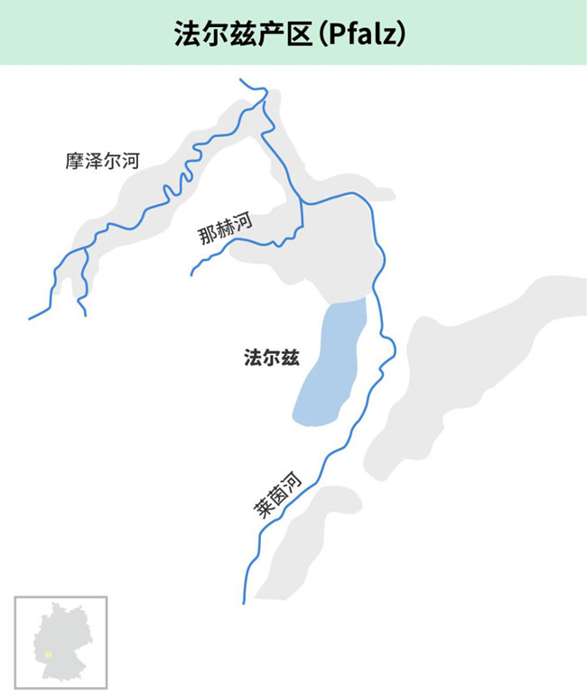 法爾茲產區位于德國的西南部,地處哈茨山(Haardt Mountains)和萊茵河之間,北接萊茵黑森(Rheinhessen),南部、西部則與法國接壤,其葡萄園南北綿延80余公里。從面積上來說,法爾茲是德國第二大產區,但其產量時常能夠占據13產區之首。