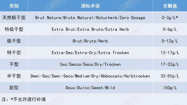 需要注意的是,天然極干型起泡酒是不允許使用含糖的調(diào)味液進行補液的,表中0-3g/L的含糖量指的是二次發(fā)酵后酒中殘?zhí)堑暮糠秶?/span>