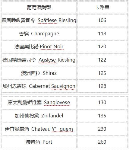 葡萄酒的熱量與其所含的酒精度息息相關(guān)(參考下表),因此不能簡(jiǎn)單地用白葡萄酒、紅葡萄酒來做比較。