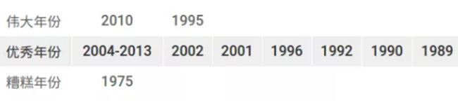 對于夜丘和博訥丘的紅葡萄酒來說,70、80年代大多乏善可陳,其中夜丘在80年代的表現比博訥丘還要更差一些,不過總體算得上半斤八兩。1975年對于勃艮第則是個噩夢,幾乎所有產區的紅白葡萄酒都表現糟糕。除非1975年對你有什么特殊意義,否則應該盡量避開這個年份。