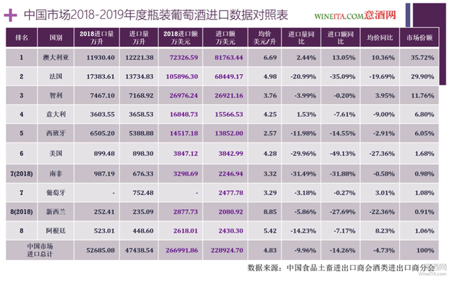 排名第一的澳大利亞瓶裝葡萄酒進(jìn)口總量為12221.38萬升,進(jìn)口總額為8.1763億美元,相比2018年分別增長2.44%和13.05%。進(jìn)口均價為6.69美元/升,相比2018年增長了10.36%。占據(jù)了35.72%的市場份額。相比2018年度27.1%的市場份額,增長了近32%。