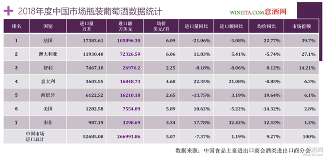 排名第二的法國瓶裝葡萄酒進(jìn)口總量為13734.83萬升,進(jìn)口總額為6.8449億美元,相比2018年分別下降20.99%和35.09%。進(jìn)口均價為4.98元/升,相比2018年下降了19.69%,占據(jù)了29.90%的市場份額。對比2018年占據(jù)39.7%的市場份額,跌幅超過25%。