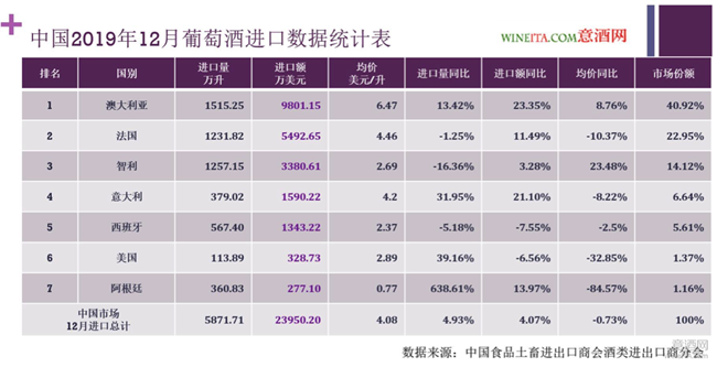 讓意酒網(wǎng)對阿根廷引起關(guān)注的原因,是下圖這張2019年12月葡萄酒進(jìn)口數(shù)據(jù)統(tǒng)計表,排在第七位的阿根廷,進(jìn)口量同比暴增638.61%,進(jìn)口額卻只增長了13.97%,進(jìn)口均價只有0.77美元/升,下滑幅度達(dá)到84.57%。當(dāng)然,排在第四位的意大利,在2019年12月也出現(xiàn)了進(jìn)口量同比增長31.95%,和進(jìn)口額同比增長21.1%的優(yōu)異增長。