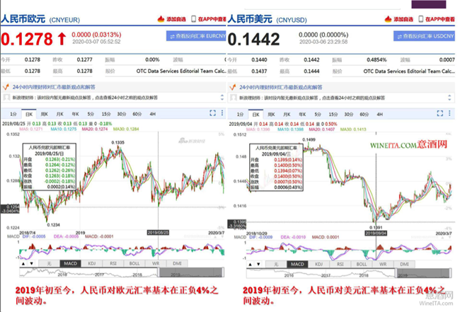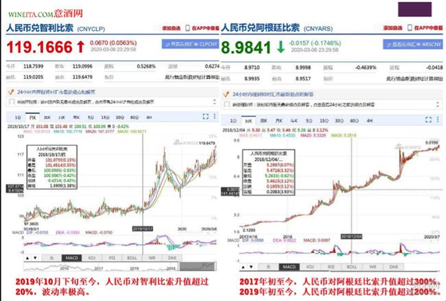 意酒網(wǎng)搜索了人民幣對主要葡萄酒生產(chǎn)國的匯率。發(fā)現(xiàn)2019年以來,人民幣對美元和歐元匯率一直在正負(fù)4%的幅度內(nèi)波動。但是從2017年初至今,人民幣對阿根廷比索的匯率升值達(dá)到300%,從2019年初至今,人民幣對阿根廷比索的匯率升值達(dá)到200%。原來時因為匯率的大幅度波動,導(dǎo)致阿根廷葡萄酒的進(jìn)口價格大幅度下跌。這種匯率變動,短期看對阿根廷葡萄酒價格有利,但是從長期看,阿根廷葡萄酒蘊含較大風(fēng)險。