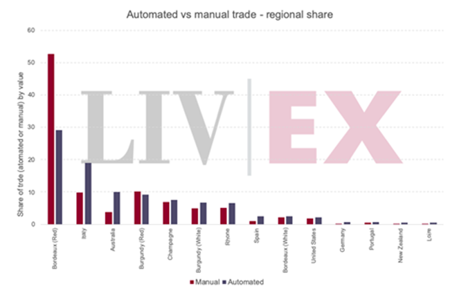 下圖按酒區來顯示手動和自動交易的比例。 由此可見,波爾多等傳統酒區在采用前者的比例要比后者高得多。