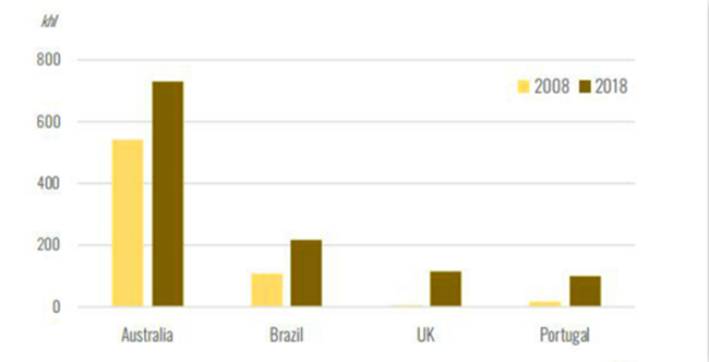近年來,全球涌現出了很多新興起泡酒生產國,諸如英國(平均年度增長率33%)、葡萄牙(平均年度增長率18%)、巴西(平均年度增長率7%)、澳大利亞(平均年度增長率3%)。其中,英國的起泡酒產量占本國葡萄酒總產量的70%以上。