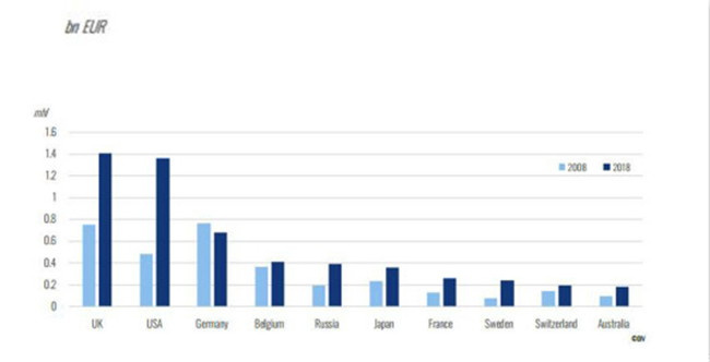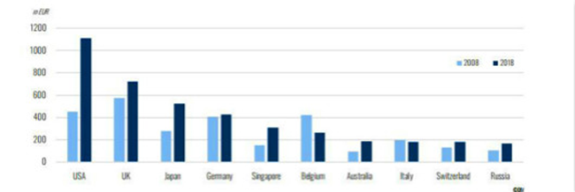 2008年-2018年期間,美國、俄羅斯、英國的平均年度增長率分別為11%、7%、6%。