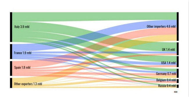 全球主要起泡酒出口市場:意大利(3.9億升)、法國(1.9億升)、西班牙(1.8億升)、其它國家(1.3億升)。