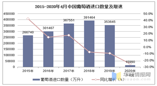 2015-2020年4月中國葡萄酒進口數量及增速