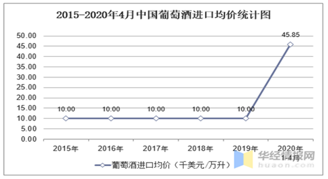 2015-2020年4月中國葡萄酒進口均價統計圖