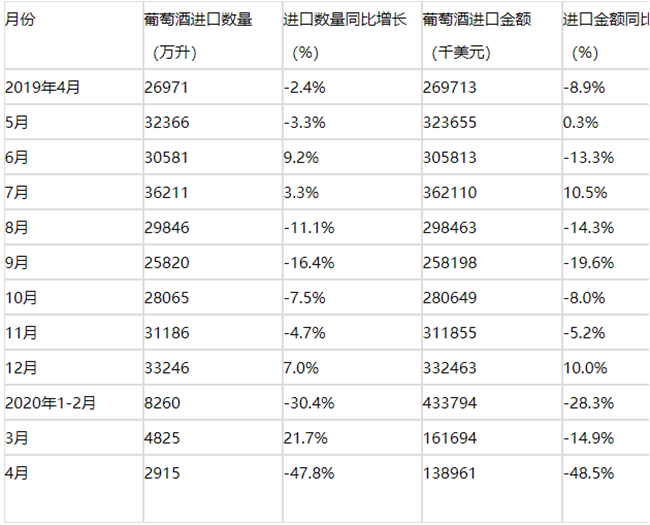 2015-2020年4月中國葡萄酒進口金額及增速