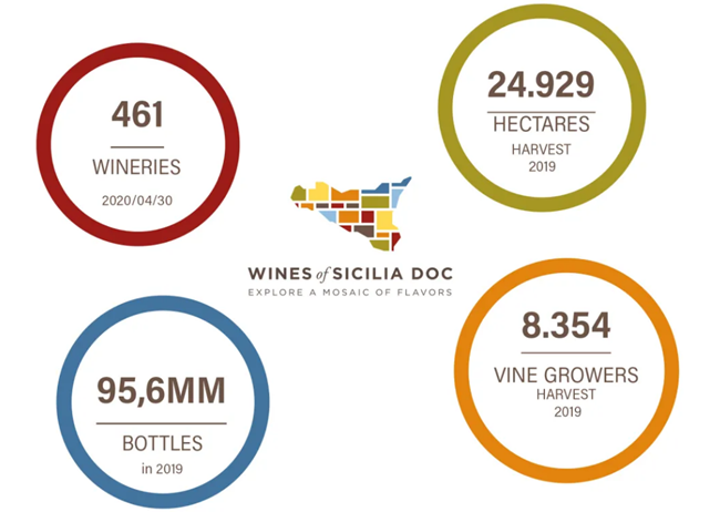 2011年11月22日,西西里法定產(chǎn)區(qū)(SICILIA DOC)由意大利農(nóng)林部正式承認通過。2019年,帶SICILIA DOC標簽的有460多家酒莊,占約25,000公頃的葡萄園,8354位種植者,超9,500萬瓶的裝瓶量。
