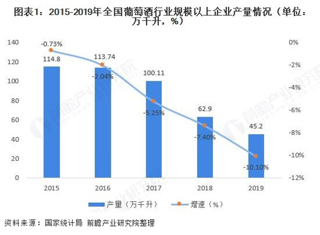 我國葡萄酒在經(jīng)歷了高速發(fā)展后自2013年進(jìn)入結(jié)構(gòu)性調(diào)整期,近年來行業(yè)產(chǎn)量、營業(yè)收入和利潤總額均呈現(xiàn)不同程度的下滑。在產(chǎn)量方面,為尋求供需平衡,行業(yè)持續(xù)降產(chǎn),2019年全國葡萄酒行業(yè)規(guī)模以上企業(yè)實(shí)現(xiàn)葡萄酒產(chǎn)量45.2萬千升,同比下滑10.1%。