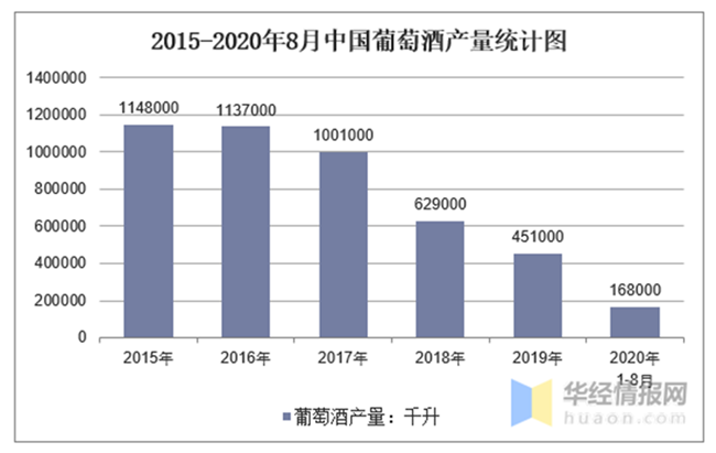 華經(jīng)產(chǎn)業(yè)研究院數(shù)據(jù)顯示:2020年8月中國葡萄酒產(chǎn)量為21000千升,同比下降22.2%;2020年1-8月中國葡萄酒產(chǎn)量為168000千升,同比下降28.8%。