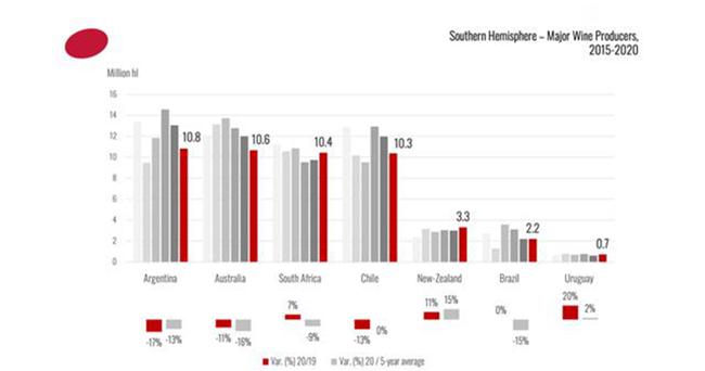 2020年,南半球的產量為49 億升(mhl),為過去15年的最低水平,仍占全球葡萄酒產量的21%。