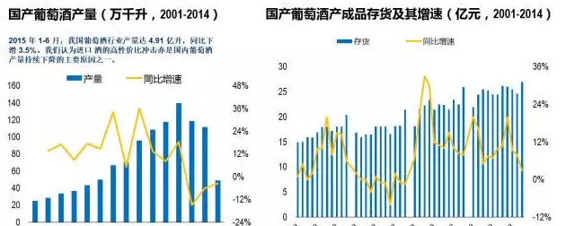 回顧國產(chǎn)葡萄酒的發(fā)展,在經(jīng)歷近十年產(chǎn)量年均17%的高速增長后,2012年到達(dá)頂峰;行業(yè)收入在2001-2012年間年均復(fù)合增速達(dá)23%;2013年,經(jīng)濟(jì)維持低景氣,“三公消費”限制加劇,行業(yè)量價齊跌,處于景氣低谷;同時產(chǎn)成品同比增速額和庫存壓力處于歷史高位,產(chǎn)量、行業(yè)收入和利潤均出現(xiàn)大幅下滑。但經(jīng)過2014年的庫存消化,行業(yè)產(chǎn)成品存量增速逐步放緩,產(chǎn)量下降速度也開始減緩,收入和利潤出現(xiàn)回升。
