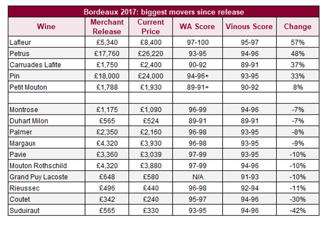 隨著2017年份現已在瓶, 預計酒評家在未來幾個月將發布在瓶分數。日前,英國酒商剛在倫敦的波爾多年度品鑒會Union des Grands Crus de Bordeaux 上品嘗2017年份葡萄酒。現在是時候看看此年份自發布以來的價格走勢。