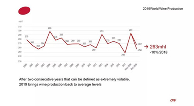 據國際葡萄與葡萄酒組織(OIV)最新數據顯示,2019年全球葡萄酒產量為263億升(mhl),同比2018年下降了10.54%。