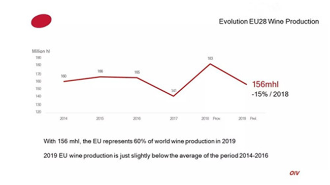 歐盟國家2019年葡萄酒產量156億升(mhl),占據全球葡萄酒產量的60%,略低于2014-2016年平均水平。