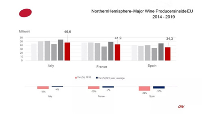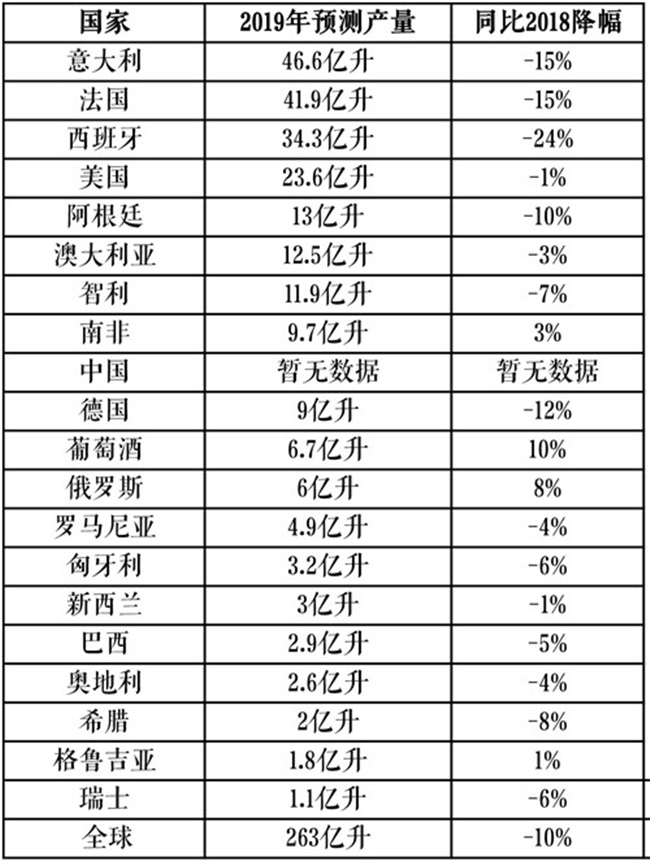 • OIV預測:2019年全球葡萄酒產量比去年下降10.54%,法國、意大利、西班牙等主產國均減產