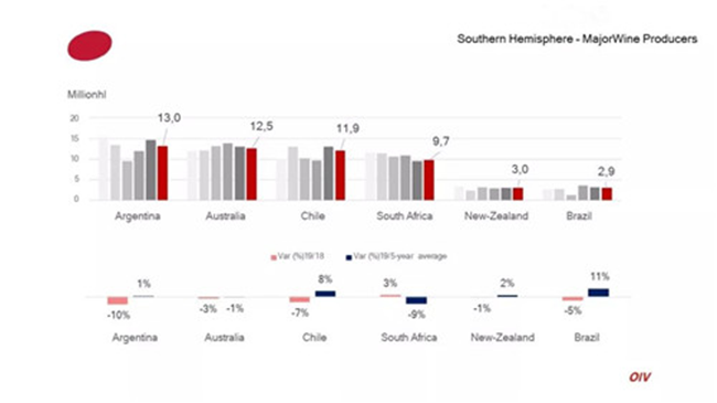 南半球2019年葡萄酒產量為54億升(mhl),占據全球葡萄酒產量的20%,與2008-2018年平均產量持平。