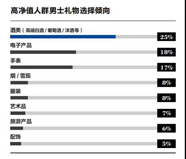 25%的高凈值男士喜歡選擇酒類作為禮物進行贈送。這種現象也反映在收藏領域。