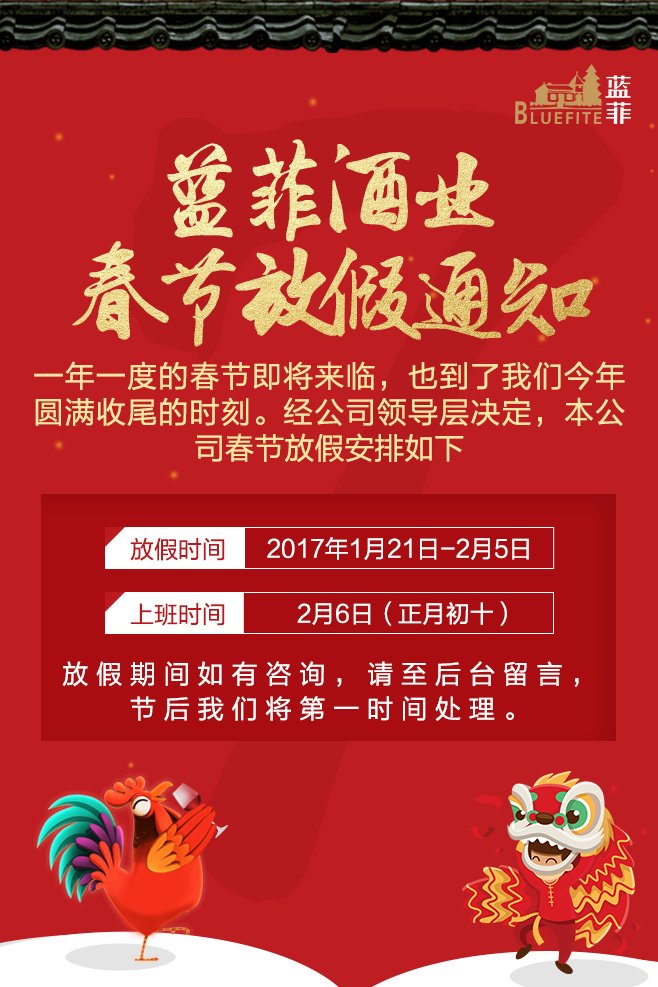 值此2017新春佳節即將到來之際,藍菲酒業全體員工恭祝您和您的家人:闔家幸福,吉祥安康!2017更加輝煌!