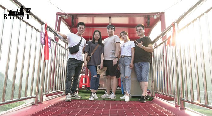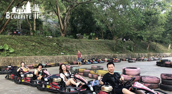 當然啦,除了飛龍蹦極,這里還有很多極限活動等著我們來打卡,寶晶宮跑跑卡丁車圓了我們的賽車夢,讓我們親身體驗速度與激情,過一把賽車手的癮;天山滑道帶領我們在森林與喀斯特地貌之中急速穿行,真實還原過山車叢林穿越,快速、刺激而又唯美;坐上天鵝湖滑索,飛越千畝湖面,仿佛乘風前行,將山青水秀、碧波蕩漾的美景盡收眼底......在一輪又一輪驚險刺激的游戲項目中,藍菲伙伴們的工作壓力都得到了盡情的釋放,在美景中返璞歸真,共同沉浸在這質樸而浪漫的世外桃源。